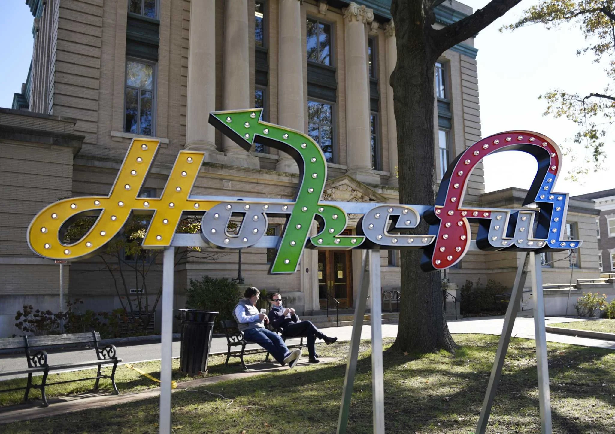 "Hopeful" is a work of art created by renowned artist Charlie Hewitt. It's a temporary art piece that was put in place on the front lawn of the Greenwich Arts Council. The sign is built to resemble roadside signs from the 50s and 60s that would typically feature arrows pointing to a business with elaborate letters lit with incandescent bulbs, arrows, and light bulbs.