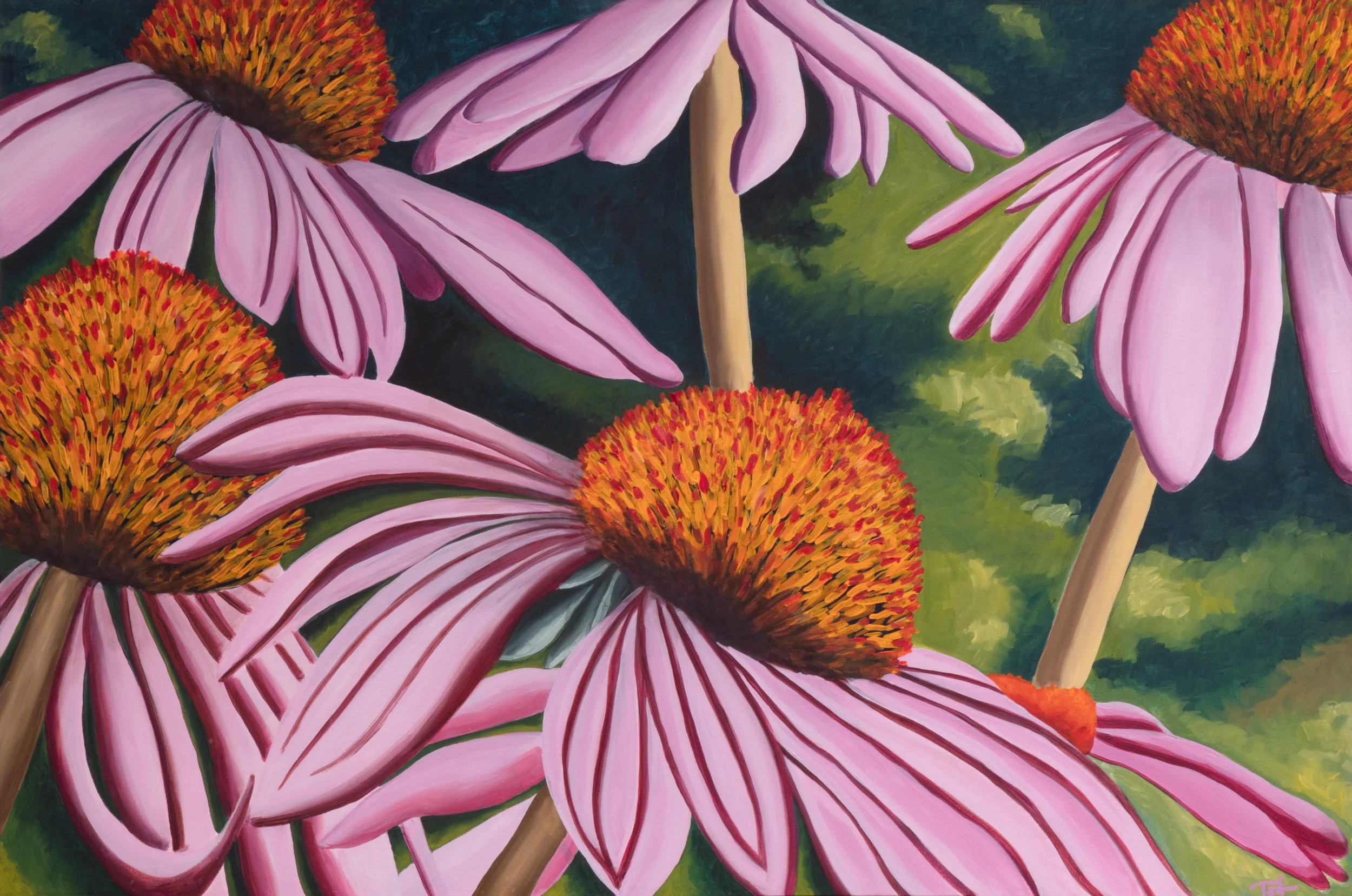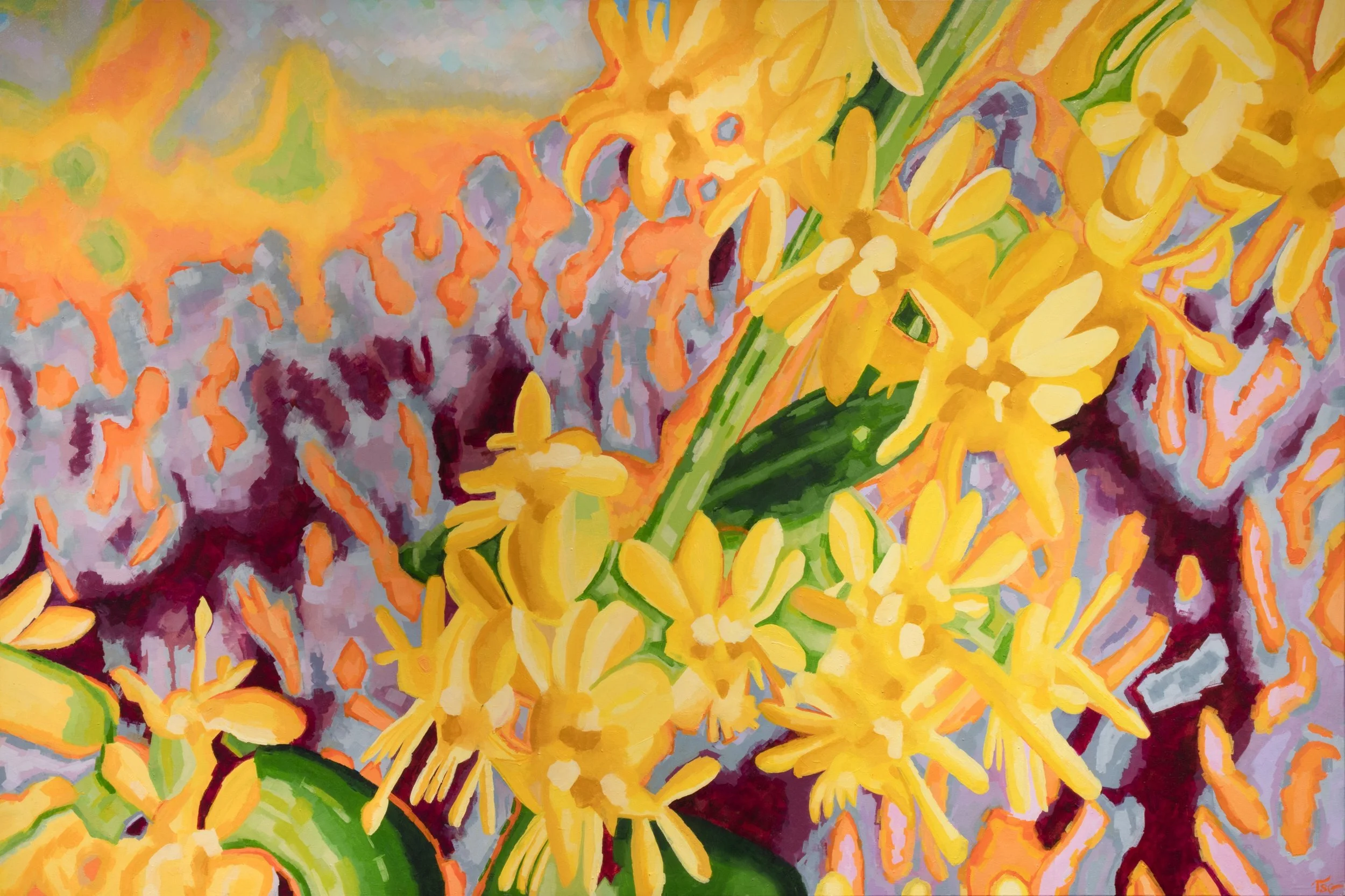 Her recent passion is transforming the simple subject of flowers into vibrant, expressive pieces that engage the viewer's senses and emotions. Concentrating on elements of the flowers, rather than their whole, she sets bold colors against subtle contrasts and focuses on different angles, often on large surfaces, to portray nearly hidden beauty and details.